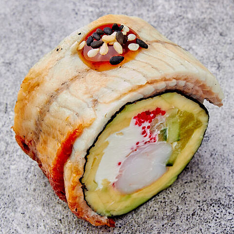 Эксклюзивный ролл от «Лосось» — гастрономическое наслаждение, которое удивит своей оригинальностью и тонкостью вкуса. Вместо традиционного риса вас ждёт нежное авокадо, наполненное сливочным сыром, сочным такуаном, огурцом и креветкой. Изысканный микс дополняет икра тобико, придавая блюду цветовую гамму и приятную деликатность. Сверху ролл покрыт бархатистым угрём и насыщенным унаги-соусом, который придаёт блюду глубину и дымный аромат. Посыпается кунжутным миксом и подаётся с салатом под ореховым соусом