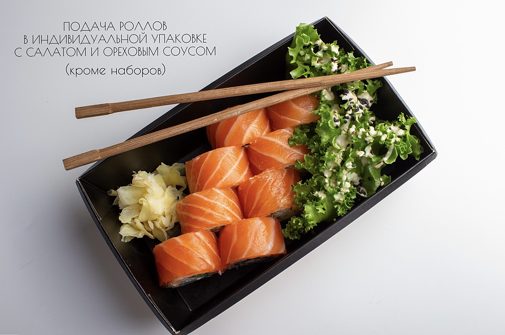 Этот ролл — настоящее удовольствие для ценителей чистых и насыщенных вкусов. Внутри нежный охлаждённый лосось, завернутый в мягкий рис и нори. Внешняя сторона ролла обсыпана ароматным кунжутом Ким Чи. Простота сочетания ингредиентов подчеркивает качество рыбы и гармонично раскрывает натуральный вкус лосося. Подаётся с сочным салатом под ореховым соусом и присыпан кунжутом